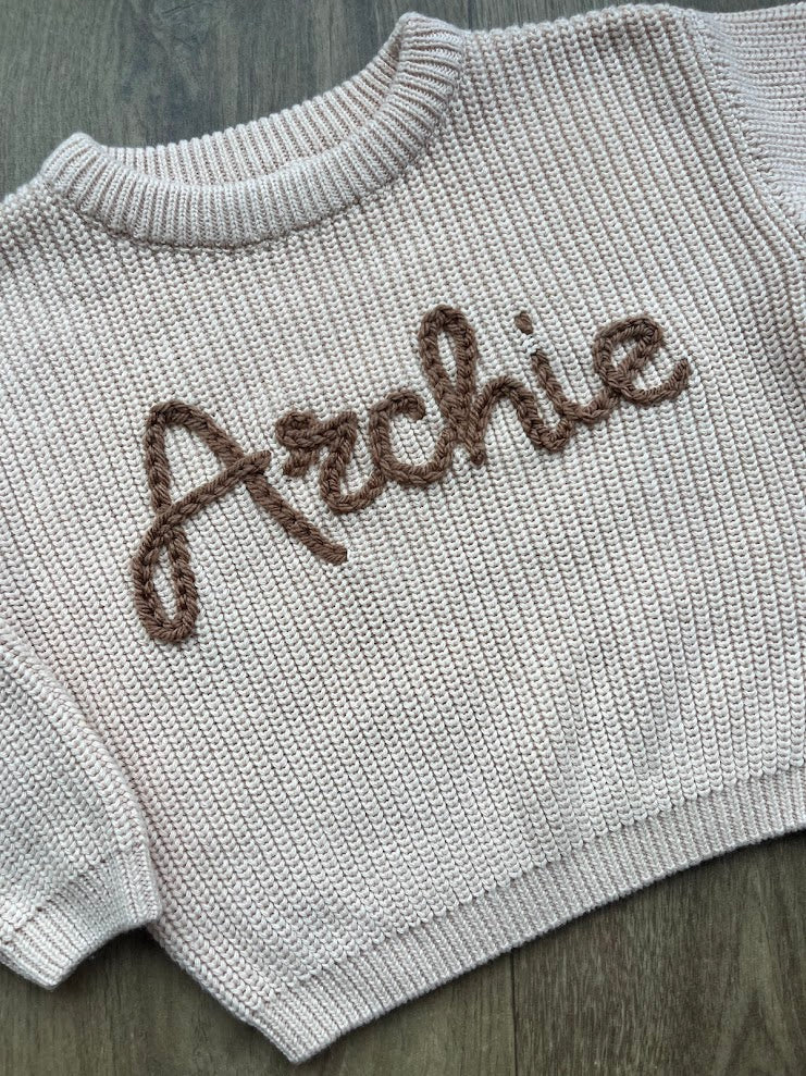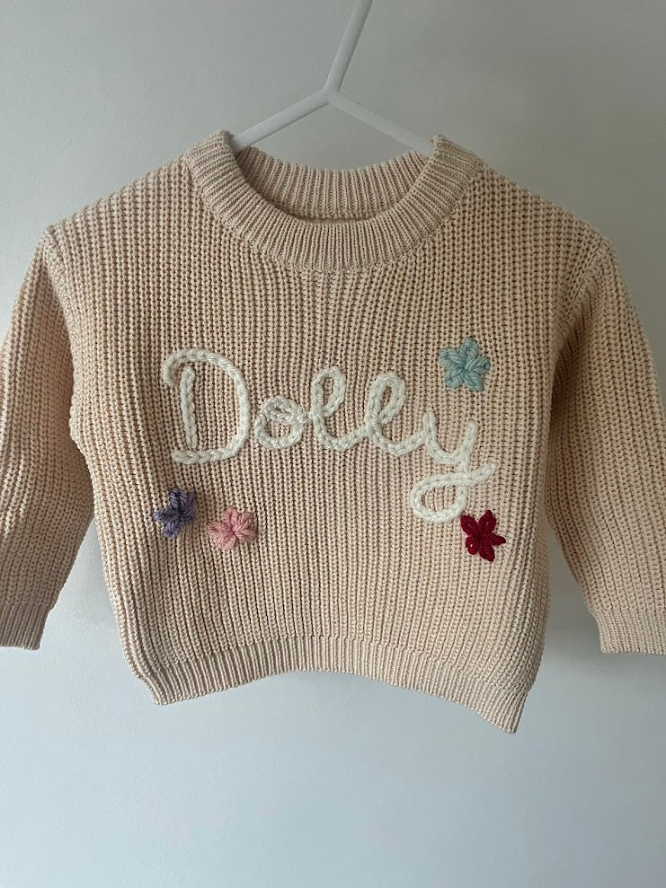 Our knit jumpers are lovingly hand embroidered, making them a unique and special piece for your little one. The soft, oversized knit is perfect for comfort and warmth. It can be personalised with a name, initial, or a sweet phrase such as 'Little Love' or 'Big Sister' for part of a special announcement.